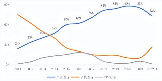 政府引导基金成立初衷是利用政府“有形之手”、发挥财政引导和放大作用,克服初创企业与高新技术领域股权融资“市场失灵”问题,从而促进创新创业、支持相关产业发展和结构优化升级。政府通过财政出资、市场化运作,弥补资金缺口、引导投资方向,兼具“政策导向”与“市场运作”双重属性。清科研究中心数据显示,2014年“拨改投”以来,政府产业类引导基金占比明显上升,而支持创新创业的基金数量明显下降。2011年产业类引导基金设立数量占政府引导基金总数的24%,2021年的占比猛增到85%,份额提升了61个百分点。同期创投基金设立数量比例从2011年占比86%下降到2021年的10%以下。
