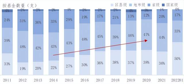 纵向来看,政府引导基金早期集中在中心城市,目前正由省级政府、省会城市向地市、县(区)快速渗透。清科研究中心数据显示,2011年至今,国家级基金设立节奏相对平稳、产业导向各有侧重,占比数量稳定在2%-4%;省级基金由早期的占比35%左右下降到20%以下,市级占比由早期的占比近50%下降到40%左右,县(区)级由早期的占比20%左右上升到40%左右。2022年一季度,全国新设政府引导基金中县(区)级占比已达50%。之所以出现这种趋势,主要是省级政府以及相当一部分市级政府基本完成了基金设立工作,有的地方甚至还出现设立过多、基金定位重复的问题。县(区)积极设立政府引导基金,一方面有发展基金投资的“跟风”因素,受上级政策和其他县(区)成功做法的激励,以及自身面临融资平台不畅等因素印象,县(区)设立基金的内在动力持续增强;另一方面,在争取省、市基金投资项目落地县(区)过程中,往往需要县(区)基金配套,由此推动县(区)加快设立基金。