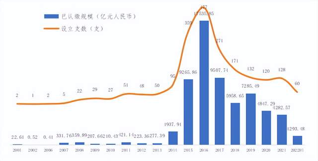 政府产业基金特别是产业引导基金 “小出资、大杠杆”,受到各级政府的大力推崇。据清科研究中心数据,中国政府产业引导基金设立可分为三个阶段:第一阶段为起步缓慢发展阶段(2010年以前),每年设立的基金数量不足50支,认缴规模平均不足100亿元人民币。第二阶段为快速发展阶段(2011年至2016年),基金设立数量呈爆发式增长态势,其中2011年为51支、认缴规模为421亿人民币,2016年创记录地达到477支、认缴规模达到17536亿人民币。第三阶段为优化整合阶段(2017年至今),基金设立规模逐年下降,2017年为271支、认缴规模9508亿元,2021年为128支、认缴规模为4283亿元。截至2021年底,政府引导基金累计设立共1988支、到位规模6.16万亿。